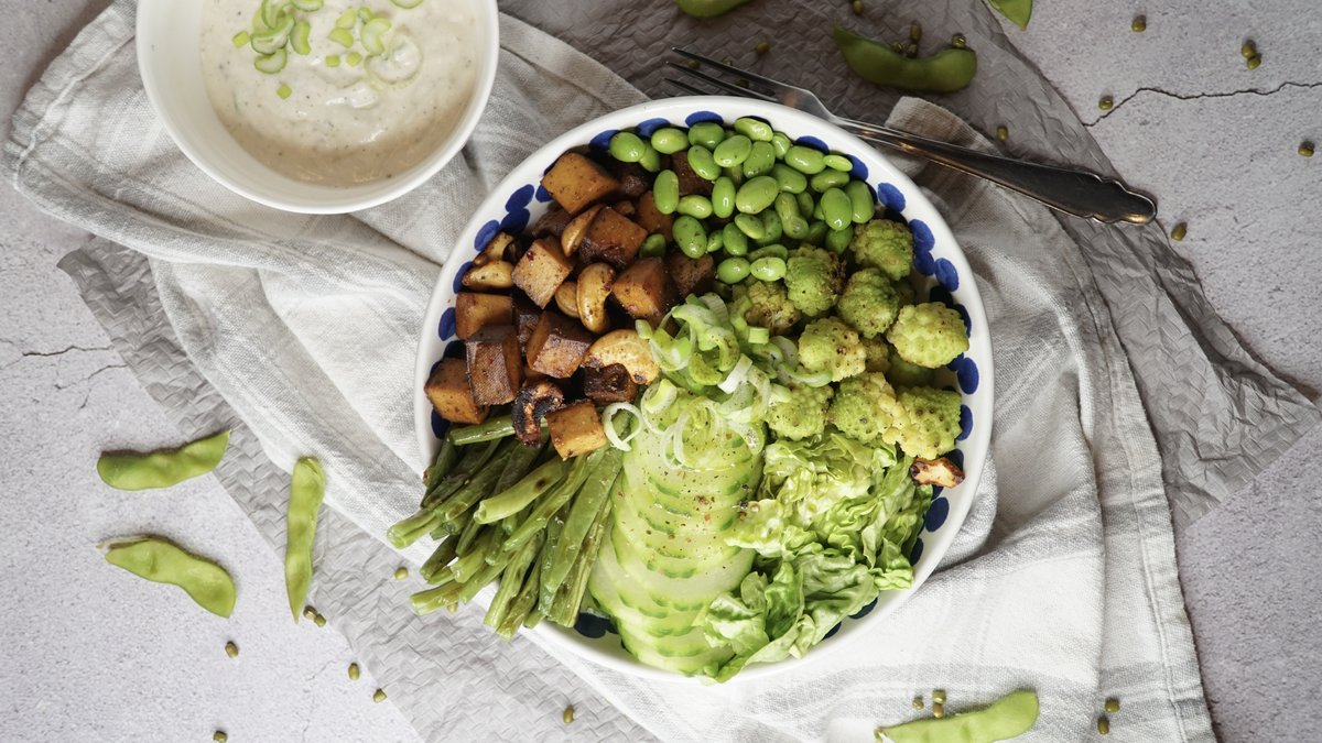 Also, konnte ich dich schon überzeugen? Grünes Gemüse ist fantastisch! Und diese grüne Buddha Salat Bowl strotzt nur so von wichtigen Nährstoffen. Übrigens, kennst du Edamame? Falls nicht – das musst du probieren! Edamame sind junge, im unreifen Zustand geerntete Sojabohnen und in Japan eine beliebte Beilage. Sie sind reich an Eiweiß und Omega-3 Fettsäuren. Ich mag diese kleinen, knackigen Bohnen unheimlich gern. Sie schmecken fantastisch nussig, lassen sich wunderbar kombinieren und harmonieren hervorragend mit Tofu.