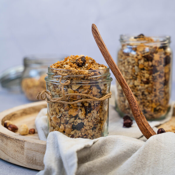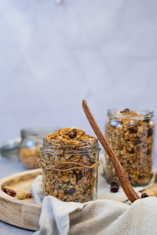 Auch kannst du so mit der Menge der Kohlenhydrate variieren. Ich kann dir Sojaflocken empfehlen. Sie sind den normalen Cornflakes sehr ähnlich, enthalten aber weit weniger Kohlenhydrate. Auch in unserem selbstgemachten Granola kommen sie zum Einsatz. Du kannst dir merken: Je mehr Kerne und Samen im Müsli oder im Riegel enthalten sind, desto niedriger der Kohlenhydratanteil. Granola kann super aufbewahrt werden und ist mehrere Wochen haltbar. Außerdem ist es wirklich kein großer Aufwand und ist in der Zubereitung sehr einfach. Man kann in kurzer Zeit eine Menge Granola machen und mit den Zutaten experimentieren.