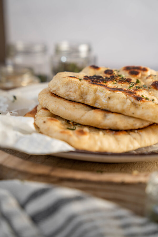 Ich mag Naan Brot wahnsinnig gerne – fast zu gerne. Es passt nämlich eigentlich nicht in eine kohlenhydratarme Ernährung. Aber es ist weich, warm und vegan! Und es ist in der Zubereitung wirklich super einfach. Die Beilage lässt sich also in Null-Komma-Nichts zaubern und passt super zu Salat, Suppe, Hummus oder zum Curry. Mit der veganen Kräuter-Butter kannst du dann wirklich nicht mehr widerstehen, versprochen! Dazu kannst du einfach Kokosöl, Knoblauch, Salz, Pfeffer und Thymian miteinander vermengen und auf die heißen Brote streichen. Naan Brot muss nicht vegan sein, es funktioniert auch mit normalem Joghurt. In diesem veganen Rezept verwende ich aber Soja-Joghurt, das mindestens genauso gut schmeckt. Das Brot lässt sich ganz einfach in einer beschichteten Pfanne braten und ist in wenigen Minuten fertig. Lediglich auf die Gehzeit des Teigs solltest du achten.