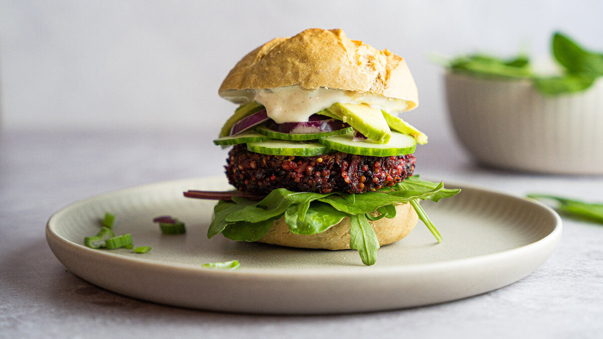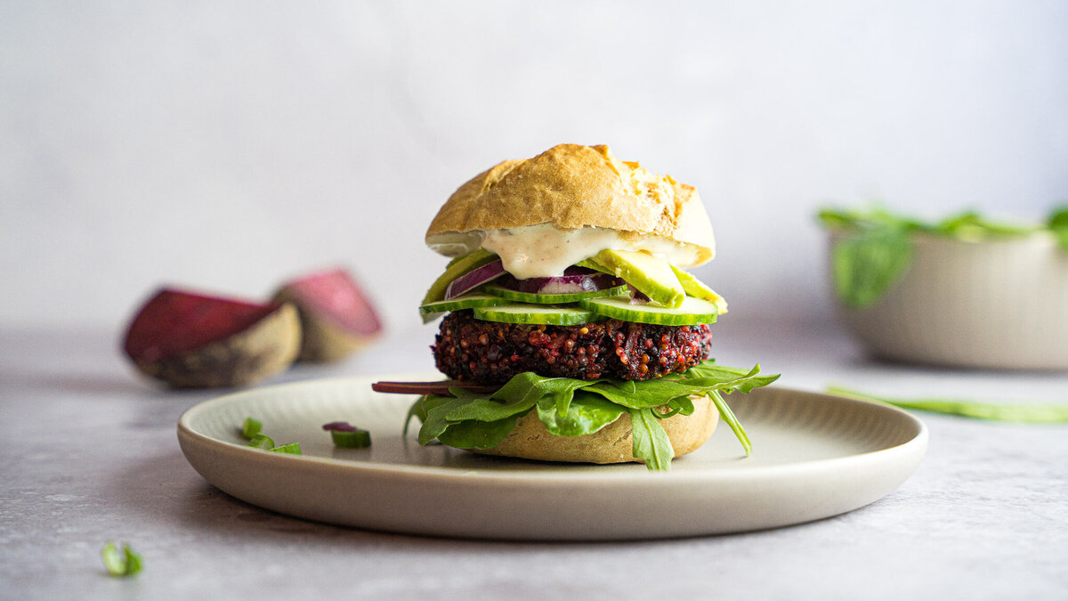 Oh, wie dieser Burger schmeckt - ich bin richtig begeistert! Die Patties bestechen nicht nur durch die einzigartige Farbe, sondern auch durch den süß-säuerlichen Geschmack, der perfekt mit den restlichen, frischen Zutaten harmonisiert. Bei den anderen Zutaten des Burgers kannst du dich wieder einmal austoben – ganz nach deinem Geschmack. Ich liebe frischen Salat in meinem Burger, am liebsten Rucola. Dazu passen knackige Gurkenscheiben, rote Zwiebel und Avocado. Außerdem eine würzige Sauce aus Soja-Joghurt.