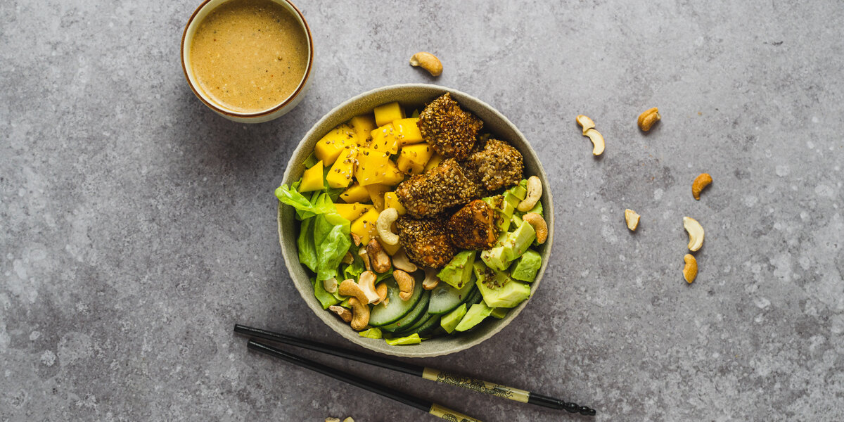 Buddha Bowl mit Sesam-Lachs und Mango
