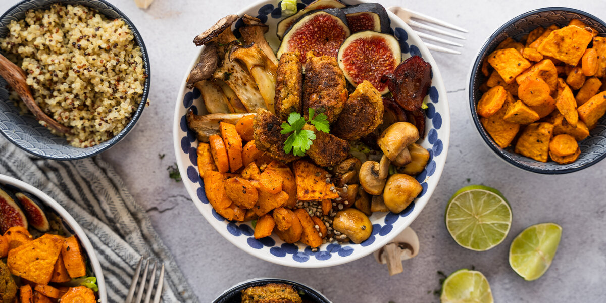 Herbstliche Bowl mit Kürbis-Falafel und Pilzen (vegan)